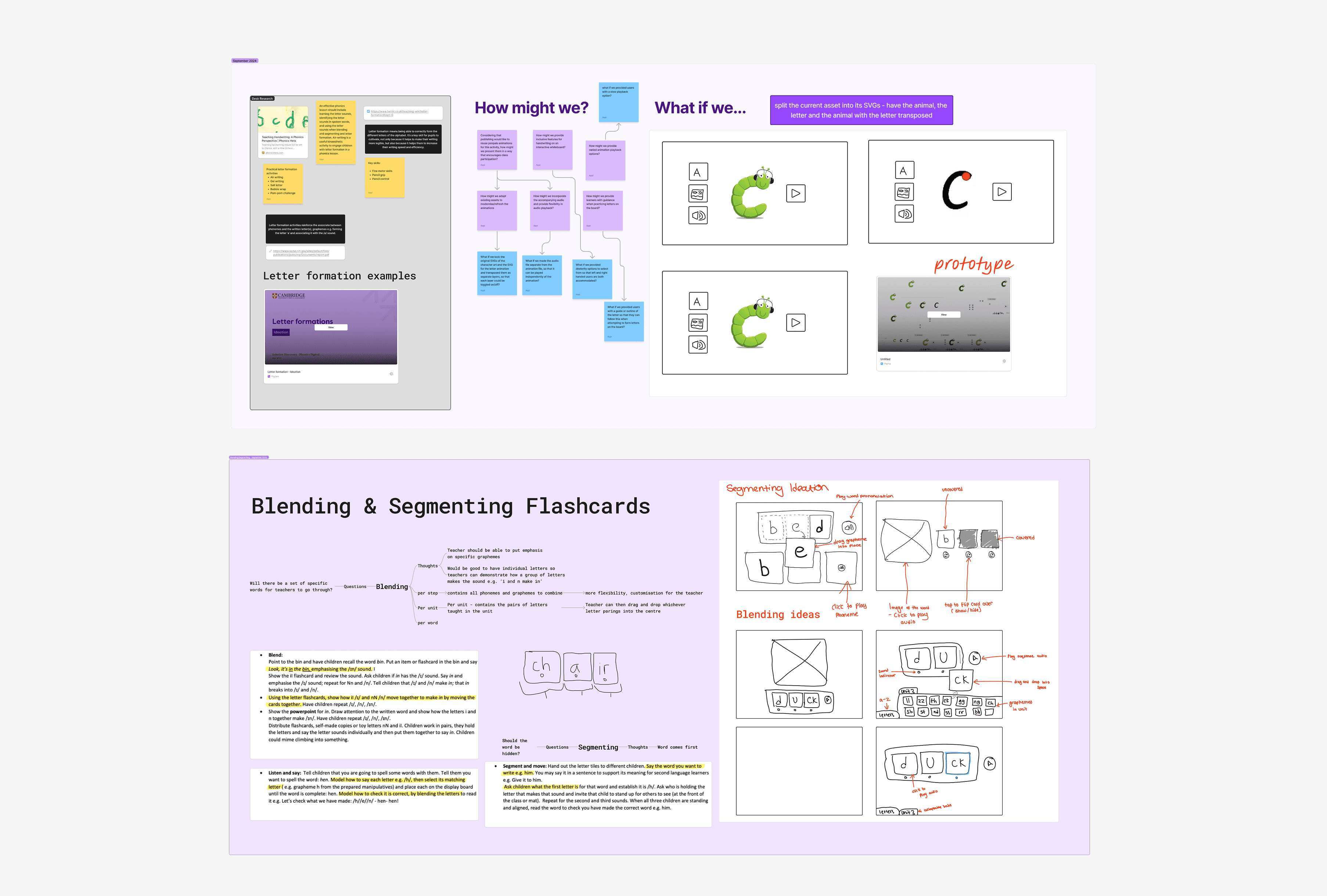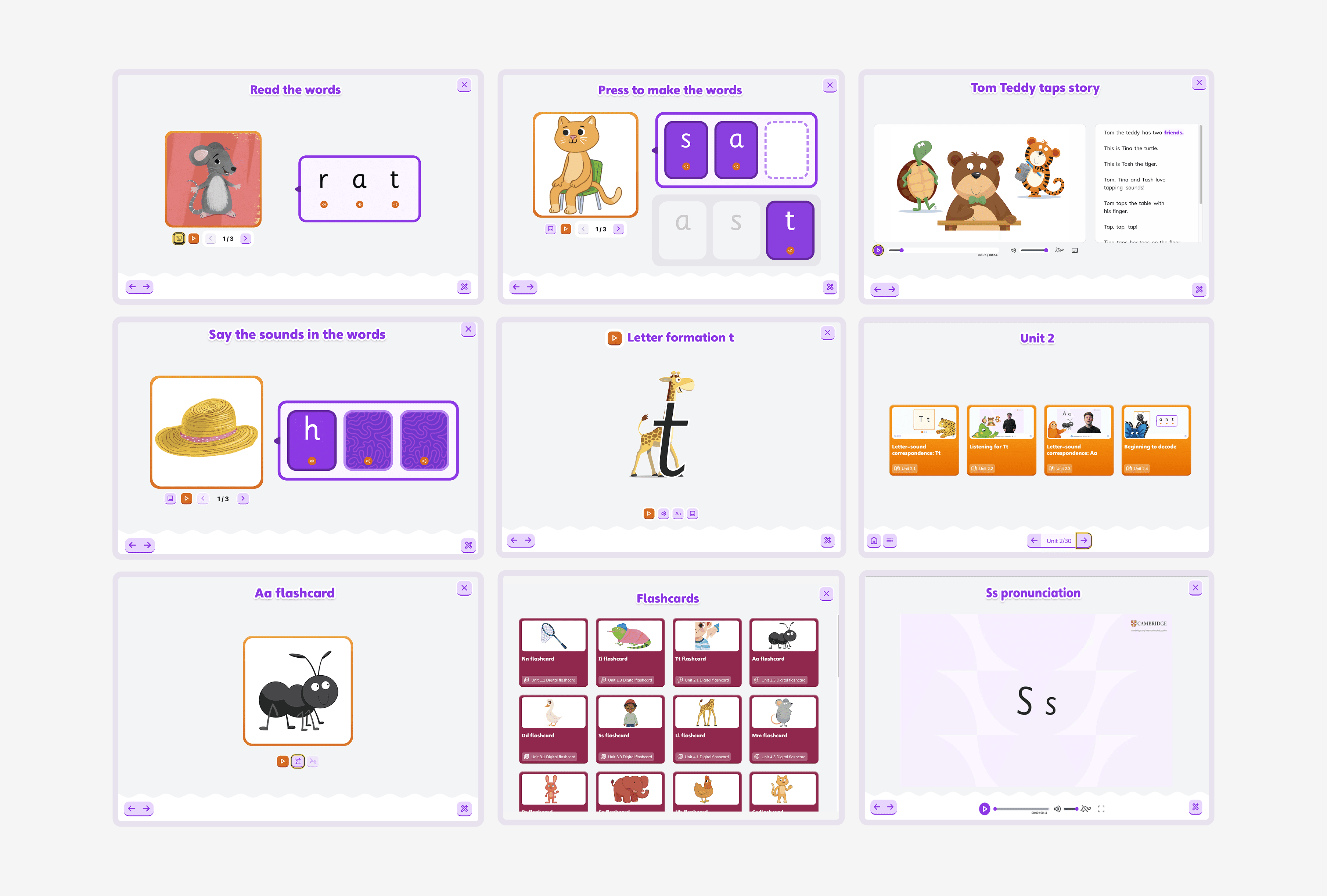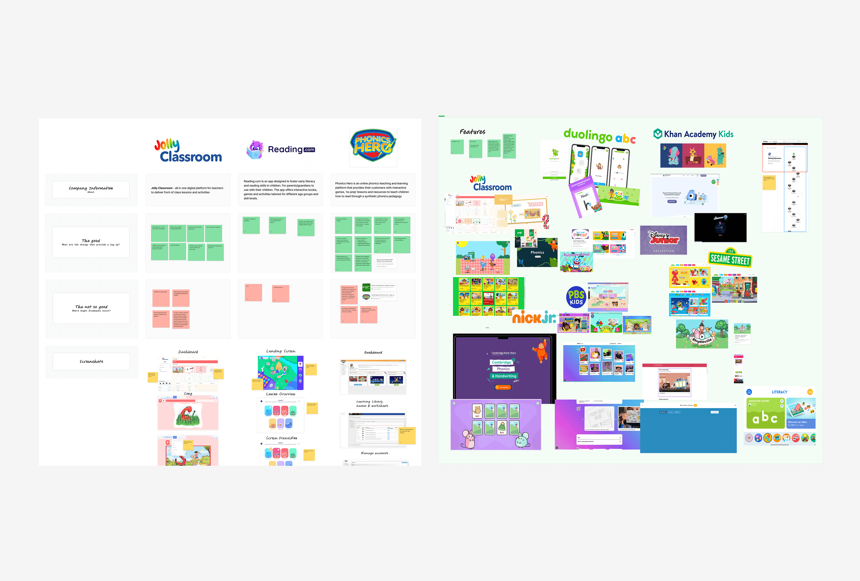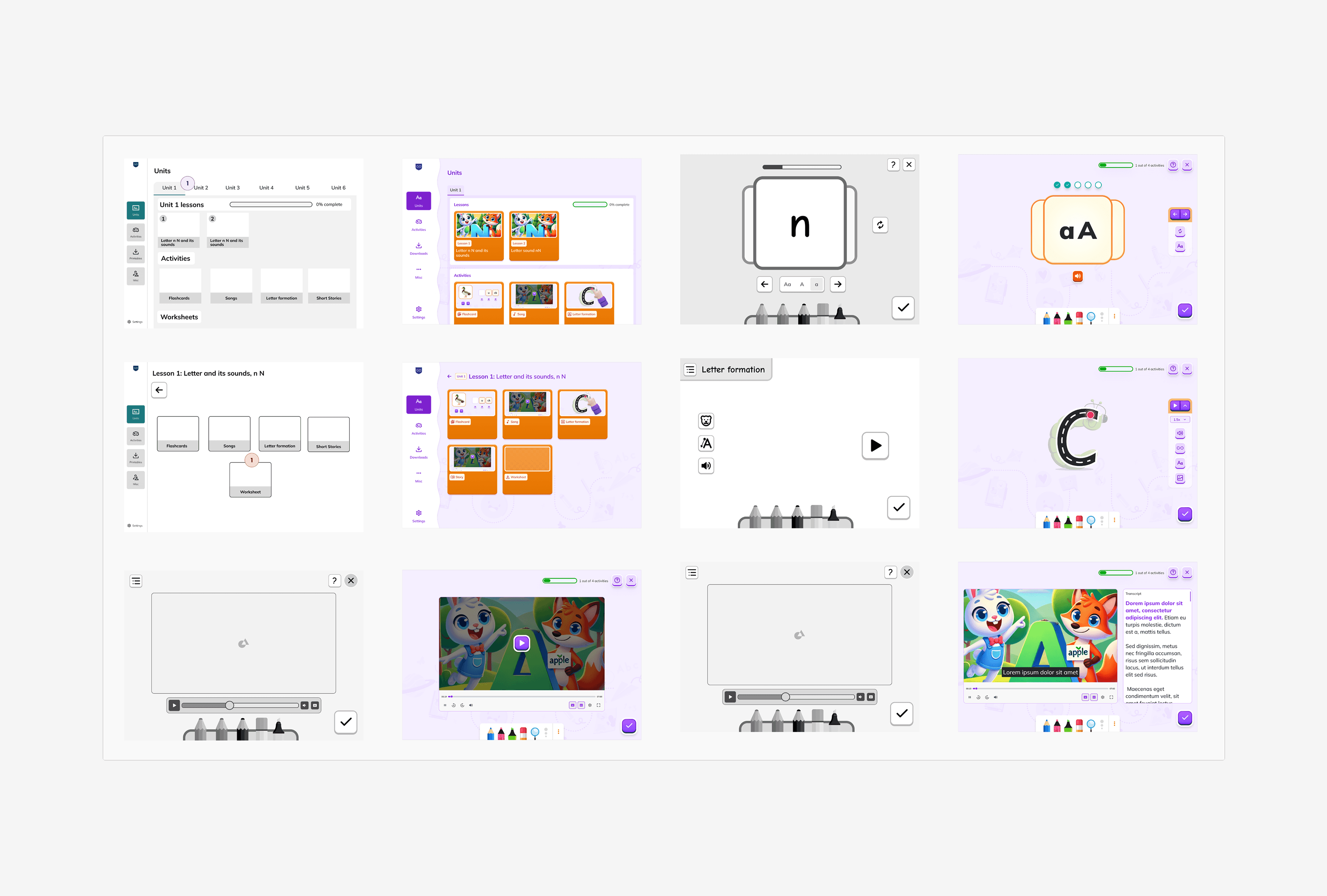 I started with desk research into phonics pedagogy to understand what effective learning looks like. This directly shaped how I designed the UX around the various learning activities. I also conduced competitor teardowns to identify effective front-of-class UX patterns: clear lesson structures, audio/visual controls, progress tracking, and interactive engagement mechanisms.